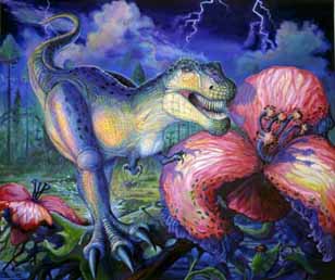 Description: The Mesozoic Era is designated as the third era of geologic time and it was also the most successful rein on Earth lasting some 180 million years, from 245 until 65 million years ago. The Mesozoic Era includes the Triassic, Jurassic and Cretaceous periods and is characterized by the predominance of reptilian life forms. Education: Kevin Wakefield was born in Rome, New York in 1964. He received a BFA in illustration Advertising, Design and Production in 1986 at Syracuse University. He taught Visual Communications at Mohawk Valley Community College as well as Life Drawing and Graphic Design at B.O.C.E.S. Vocational School. Introduction: by James Fletcher Kevin Wakefield's highly detailed paintings bring to surface a memory of hot feted swamps and lush landscapes inhabited by creatures we are used to seeing in science textbooks and blockbuster movies. Yet it all seems more real than that. These images are strangely familiar from a frame of reference we are not consciously aware of. Deep inside the head, the tabula rasa stirs. Moving silently below the surface, this primordial memory contains an imprint of the whole of evolution. It is tied to the collective consciousness we all share, a recollection of the prehistoric origin of life itself. Wakefield's visions are more than pure subject matter however. His superb sense of color, line, shading and texture make these dreamscapes come alive with an impact that is at once foreign and familiar. One feels as if he could reach into these scenes and touch them, hear them, taste them. Fear is replaced with tender fascination as we witness enormous beings interacting with their environments. Sometimes playful, always rich in colorful detail, Wakefield's paintings are something to behold on a grand scale, rendered as immense in size as their prehistoric subjects... a delight to behold from any perspective including that of our ancestral memory. Partial List of Exhibitions: 1998 A.N.E.W. Foundation For The Arts, Fort Lauderdale, Florida. 1997 Coplan Gallery, Boca Raton, Florida 1997 Graves Museum of Archaeology and Natural History, Dania, Florida. 1997 A.N.E.W. Foundation For The Arts, Fort Lauderdale, Florida. 1995-96 Good Planet Café, Fort Lauderdale, Florida. 1995 Bash, South Beach Miami, Florida. 1992 Government Center, Fort Lauderdale. 1991 Artist Gallery, Atlanta, Georgia |